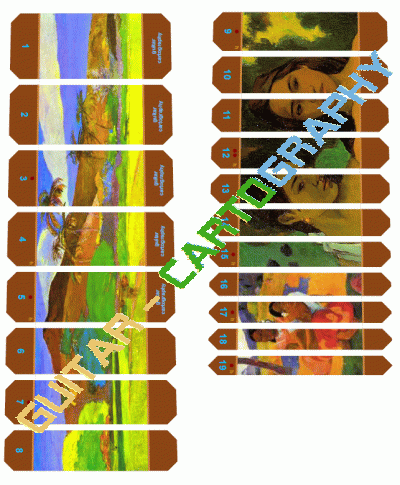 IV - Les masques réalisés aver l'atelier de dessin ( fichier pdf ou impression de ce fichier sur quel que support que ce soit ) ainsi que les fichiers de sauvegarde ( dessins de touche et bibliothèques personnelles de formes composites ) sont pour une utilisation personnelle uniquement et sont donc interdits à la vente. Ils peuvent cependant être partagés avec les autres inscrits à l'atelier de dessin si l'utilisateur l'indique explicitement. Version limitée de démonstrationPour accéder à une présentation de la version limitée de démonstration suivre le lien : Présentation de la version limitée de démonstration . ExemplesPour une guitare classiqueDessin que vous réalisez vous-même sur l'atelier de dessin. Ici ce sont trois images jpg de tableaux de Paul Gauguin qui sont appliquées sur la touche.