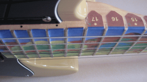 Chaque note est colorée au hasard. Notez qu'ici les masques ont été générés pour une guitare d'un joueur gaucher :