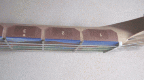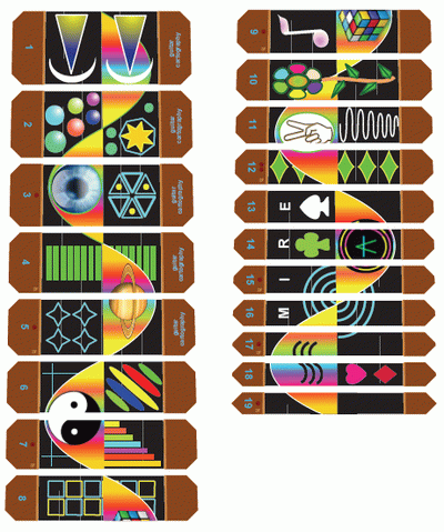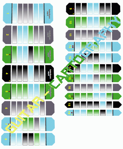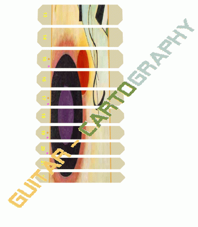 Une fois la conception des masques terminée l'atelier génère un fichier pdf que vous pouvez imprimer sur votre imprimante couleur personnelle, sur une simple feuille de papier. Il ne reste plus alors qu'à découper les masques pour les glisser sous les cordes et les appliquer sur votre guitare. Par exemple le dessin de la touche de la présentation donnera le fichier pdf couleur :